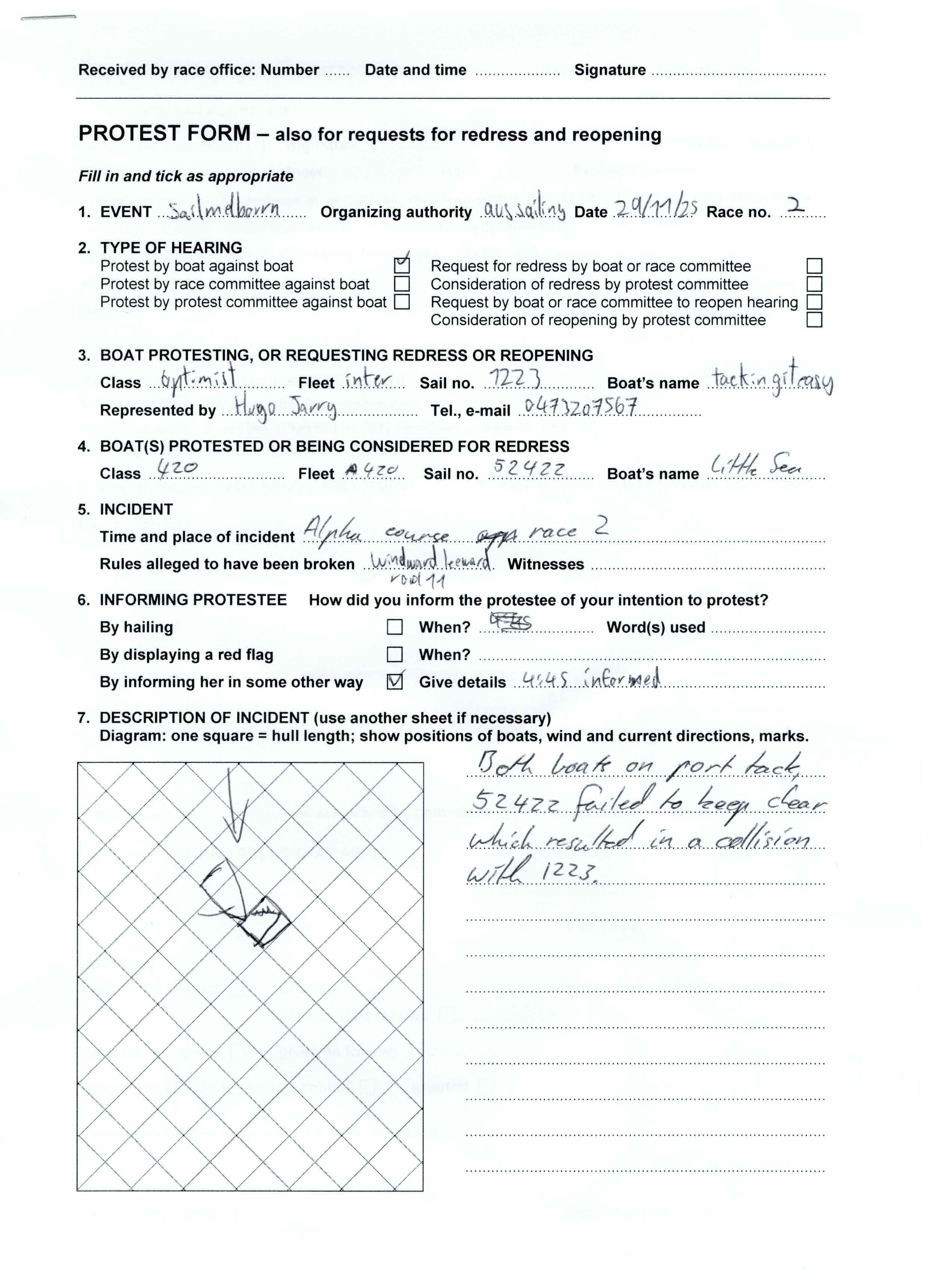 | 05 | Withdrawn | 470 | 3 | 22 | Race Committee | Hear with 4 | 28 Nov 17:30 | Request withdrawn | |